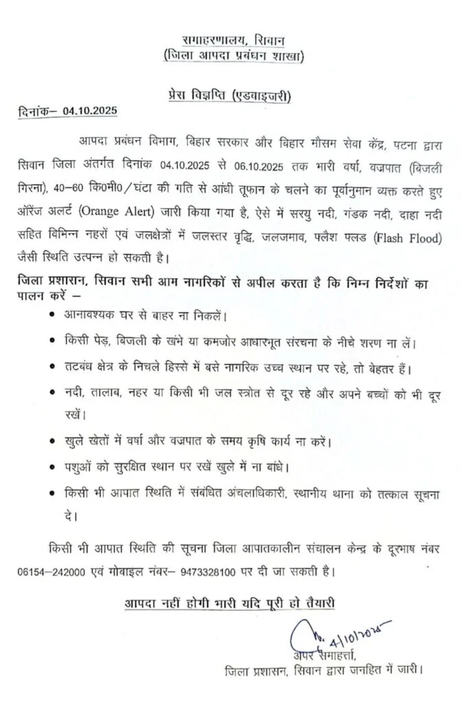 सिवान में लगातार बारिश के बाद जिला प्रशासन द्वारा प्रेस विज्ञप्ति जारी कर जिला वासियों के लिए एडवाइजरी जारी की हैं। प्रेस विज्ञप्ति के माध्यम से जारी एडवाइजरी में जिला प्रशासन के तरफ से लिखा गया है कि आपदा प्रबंधन विभाग सरकार और बिहार मौसम सेवा केंद्र पटना द्वारा सिवान जिला अंतर्गत दिनांक 04 अक्टूबर 2025 से 06 अक्टूबर 2025 तक भारी वर्षा, वज्रपात (बिजली गिरना) 40 से 60 किलोमीटर प्रति घंटा की गति से आंधी तूफान की चलने का पूर्वानुमान व्यक्त करते हुए ऑरेंज अलर्ट (Orange Alert) जारी किया गया है। ऐसे में सरयू नदी, गंडक नदी, दाहा नदी सहित विभिन्न नहरों और जल क्षेत्र में जल स्तर वृद्धि, जल जमाव, फ्लैश फ्लड जैसी स्थिति उत्पन्न हो सकती है।