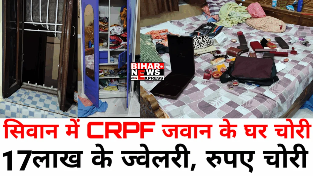 सीवान के महादेवा थाना क्षेत्र में लगातार चोरों का आतंक देखने को मिल रहा है। इस बार सीआरपीएफ जवान मनोज कुमार सिंह के बंद पड़े घर में चोरों ने भीषण चोरी की है। चोरों ने सोने की ज्वैलरी और कीमती सामान समेत 17 लाख रुपए की संपत्ति की चोरी की है। चोरों ने मकान के खिड़की को काट कर चोरी की घटना को अंजाम दिया है।