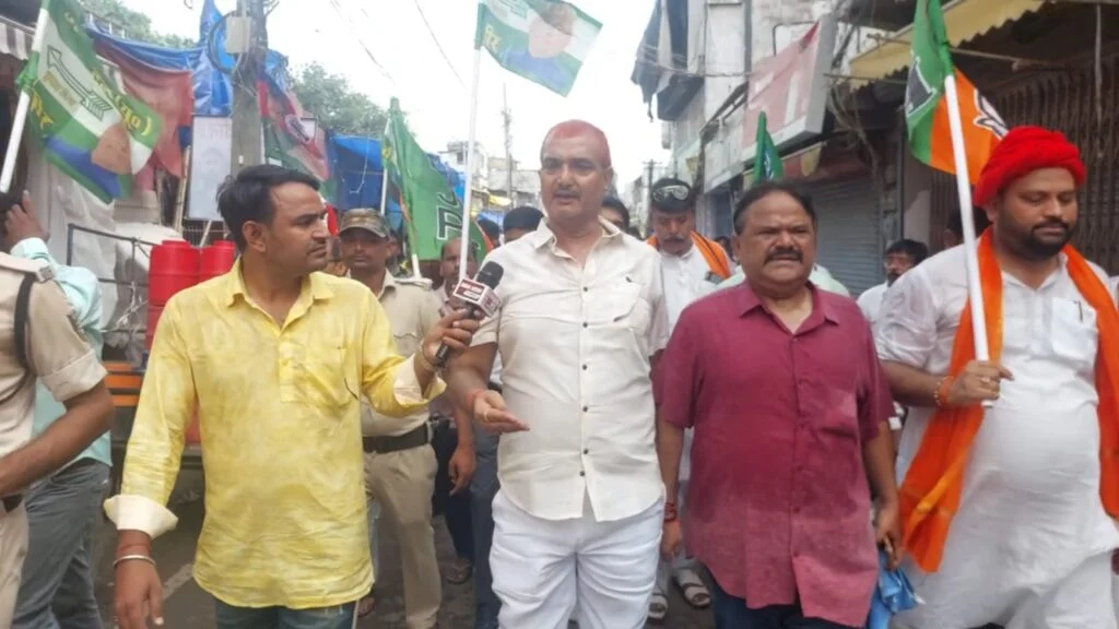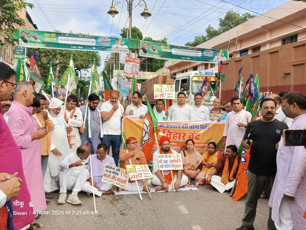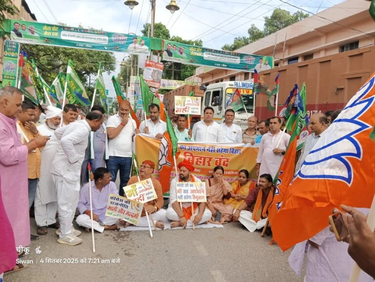 सिवान :– एनडीए द्वारा आयोजित बिहार बंद के कड़ी में आज सिवान को एनडीए के नेताओं के द्वारा बंद कराया गया जिसका नेतृत्व महिला मोर्चा जिला अध्यक्ष सुनीता जायसवाल कर रही थी। भारतीय जनता पार्टी के जिला अध्यक्ष राहुल तिवारी, जदयू जिला अध्यक्ष चंद्रकेतु सिंह, लोजपा के जिला अध्यक्ष महादेव पासवान, हम पार्टी के अभय प्रताप सिंह एवं रिजवान अहमद ने सुबह 6:00 बजे से शहर के जेपी चौक बबूनिया मोड, स्टेशन रोड सहित चप्पा चप्पा को जाम कर दिया। सिवान के दुकानदारों ने और आम जनमानस ने बंद का समर्थन किया।
